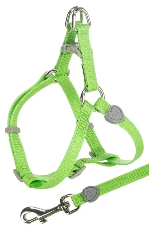 Kattsele med koppel i en klassisk step-in modell. Katten stoppar ner sina framtassar i varsin ögla på vardera sida om magremmen, matte/husse drar upp selen och knäpper ihop selen över ryggen. Enkelt och smidigt!