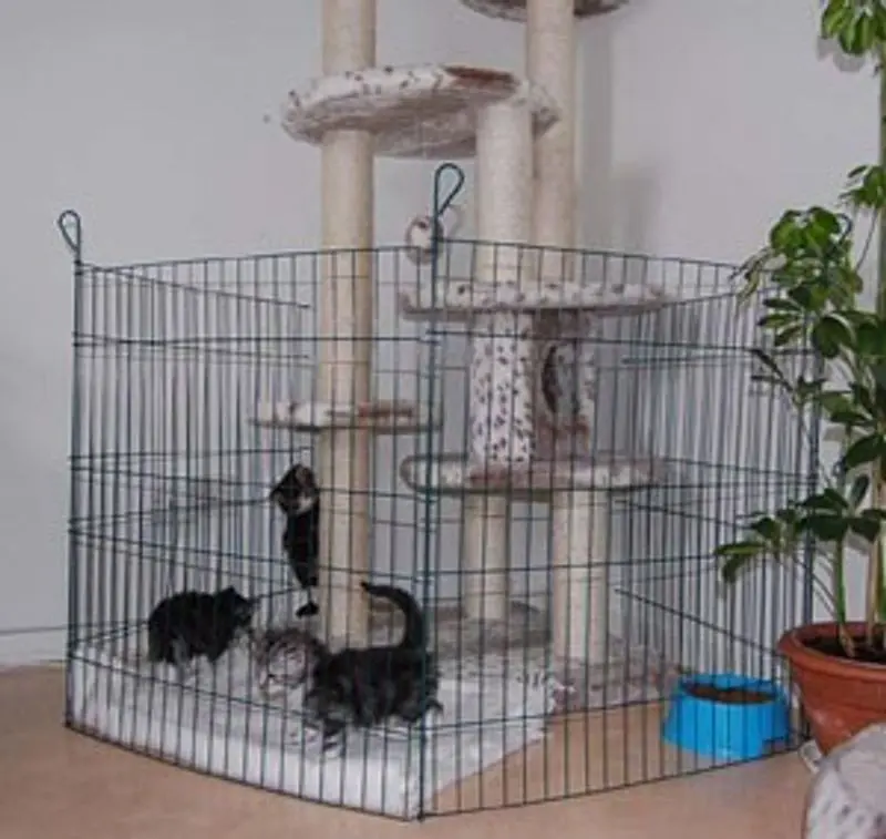 Jättebra att använda som kattungehage inomhus de första veckorna när kattungarna lär sig att bli rumsrena och upptäcker den första miljön utanför bolådan. Hagen rymmer både sovplats, matplats och liten låda. Den är en bra höjd så att kattmamman lätt kan hoppa i och ur hagen eller använda den lilla dörr man kan öppna i den ena sektionen.