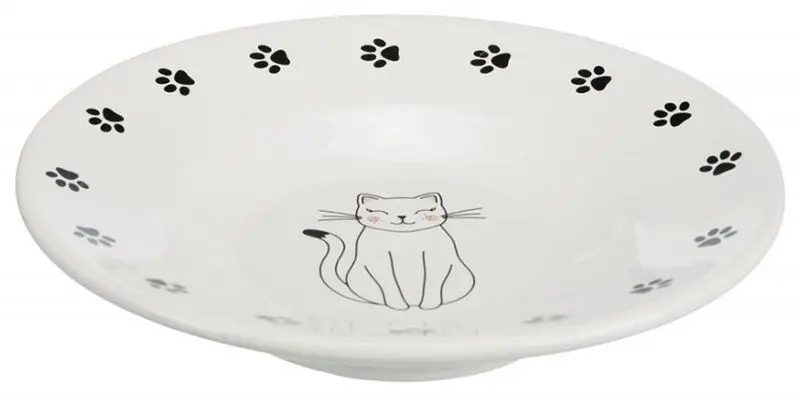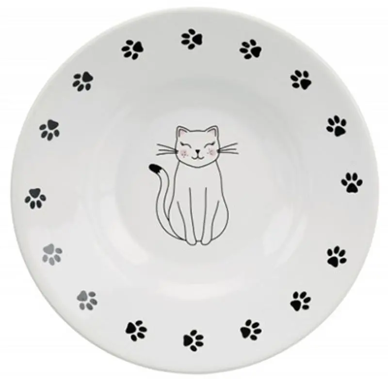 Fint keramikfat med kattmotiv i mitten och tassiga avtryck runt kanten. Ett fat som passar bra som kattmatskål för den katt som har känsliga morrhår och inte gillar att morrhåren slår i skålkanterna.