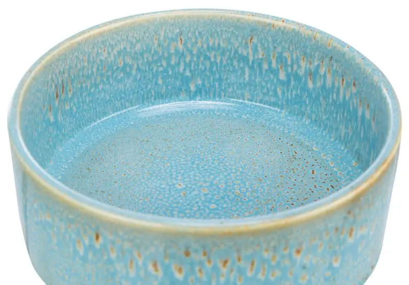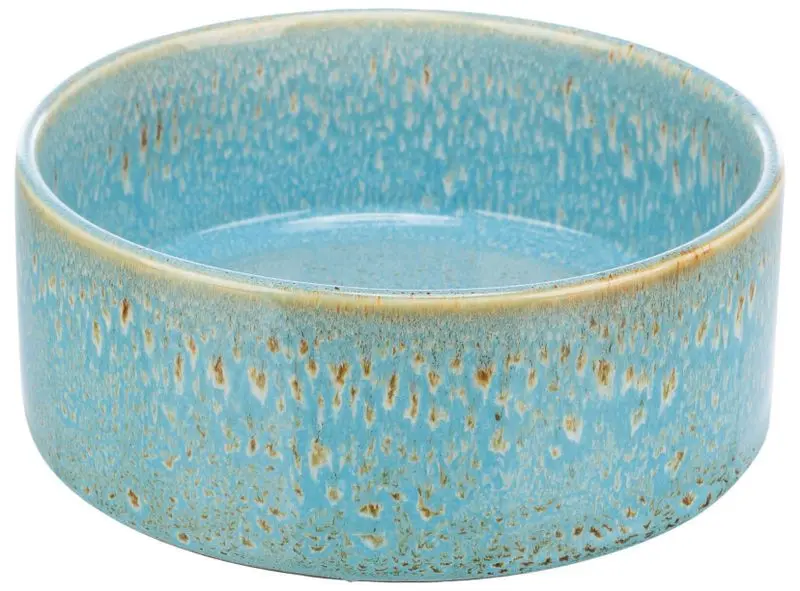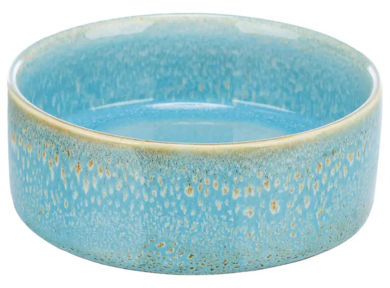 Dessa keramikskålar har en superfin glasering i turkos och brun färg, glaseringen blir lite olika på varje matskål och varje matskål är därför helt unik i sin färgsättning. Vissa matskålar har ett mindre "mönster" som skålen på den fotade produktbilden, och andra matskålar har fått lite större mönster på sin glasering.