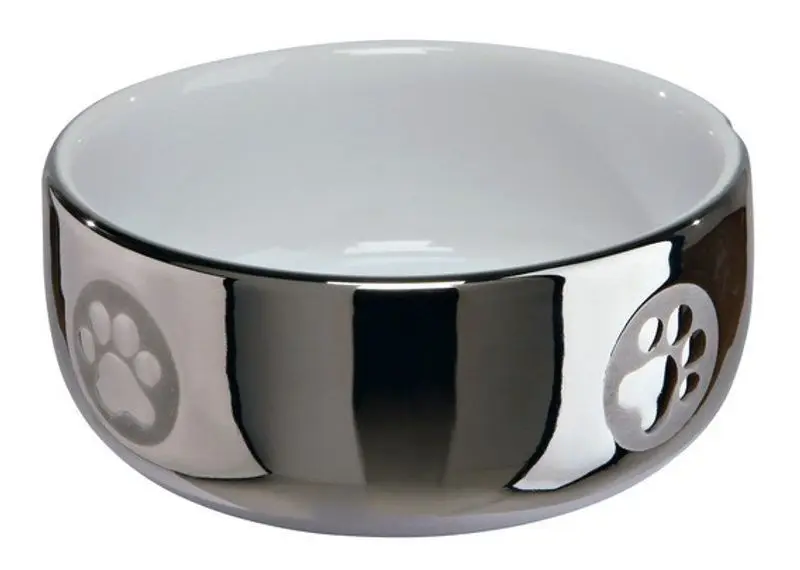 En riktigt fin till matskål din katt med läcker utsida i blank silver och diskret motiv med tass-avtryck och en stilren insida i vit färg. Klassisk kattmatskål i keramik. Används till vatten- eller kattmatskål till din katt.
