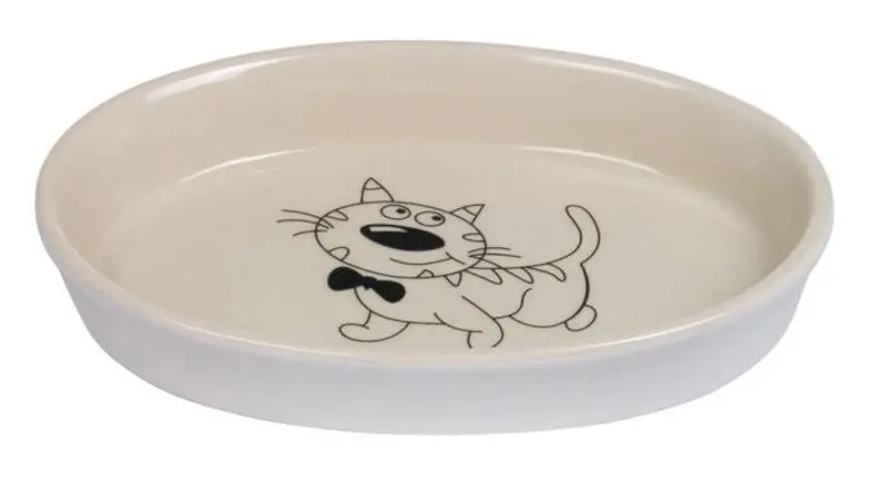 Söt matskål till din katt i keramik, välj mellan en ljusrosa eller en ljusbeige färg. Den ovala formen och den låga kanten gör kattmatskålen extra bekväm att äta ur då kattens känsliga morrhår inte behöver slå i höga skålkanter när katten äter.