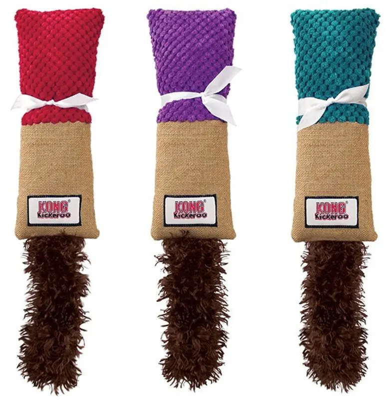 Denna unika kattleksak tilltalar kattens instinkter att förfölja och fånga byten. Kickeroons storlek, form och material är speciellt utvalda för att främja brottning och sparkar med baktassarna. Leksaken är tillräcklingt lång för att katten ska kunna bita tag i den ena änden och sparka med baktassarna på den andra. Den fluffiga lilla svansen med prassel i, bidrar med extra rörelse för att trigga kattens lek! När leken är över och det är dags för vila, kan den även tjäna som en mysig huvudkudde.
