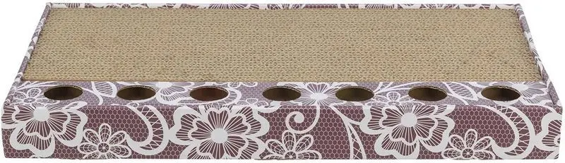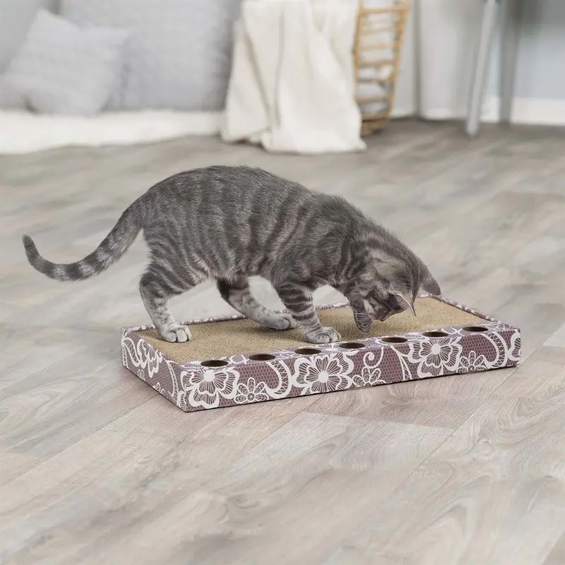Klösbrädan är rosa med blommigt mönster, och är perfekt att placera ut i hemmet så att din katt får har någonstans att klösa där till exempel ett klösträd inte ryms.