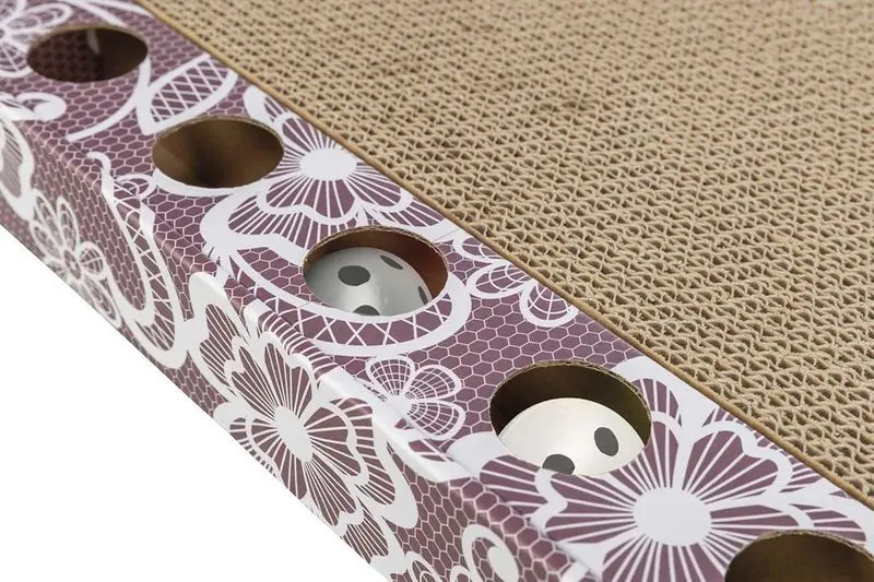 Liten och behändig klösbräda i kartong och wellpapp som inbjuder till lek. Klösbrädan har två inbyggda bollar med bjällror att försöka fånga genom hålen på ovansidan. Kattmynta medföljer.