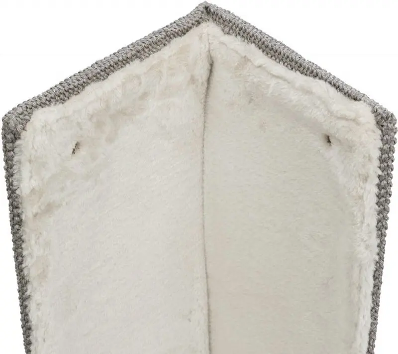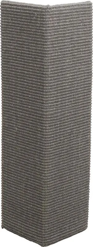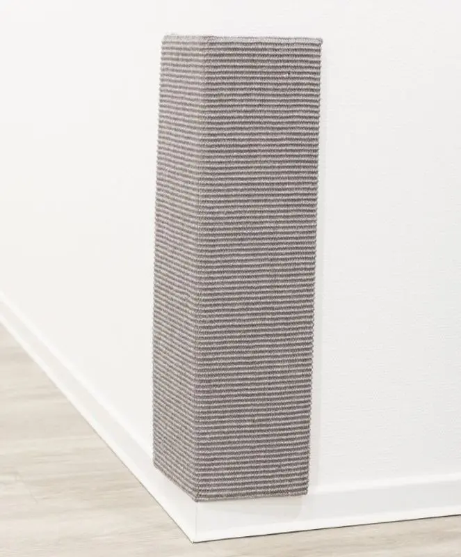 Stor och funktionell klösbräda, i grå färg, som man monterar på ett vägghörn. Baksidan på brädan är klädd i plysch och den monteras hängande.