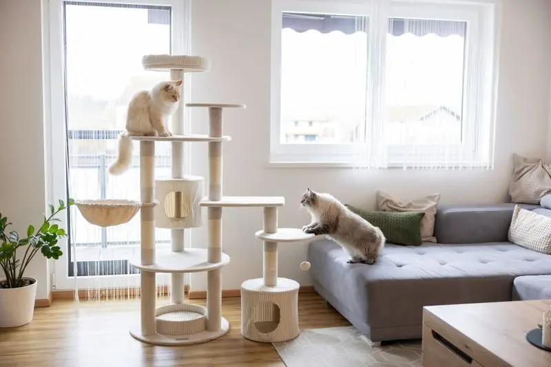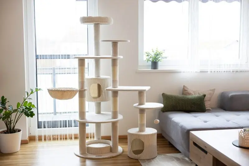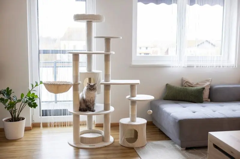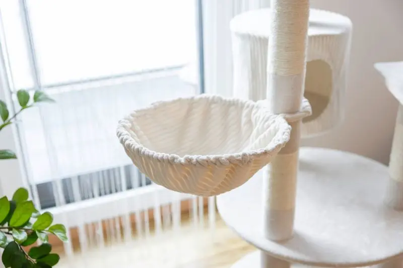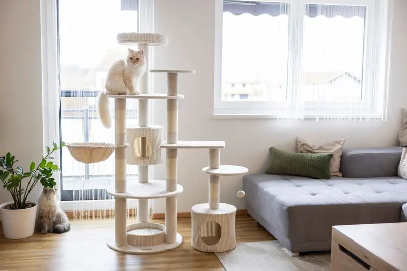 Här finns gott om platser för vila: två rymliga krypin för mysiga tupplurar, en mjuk vadderade bädd för spanläge på hög höjd, och en rund hängmatta för avkoppling mitt i klättrandet. Alla platser är mjuka och inbjudande - här kan katten både sträcka ut sig och rulla ihop som en liten kattkringla.