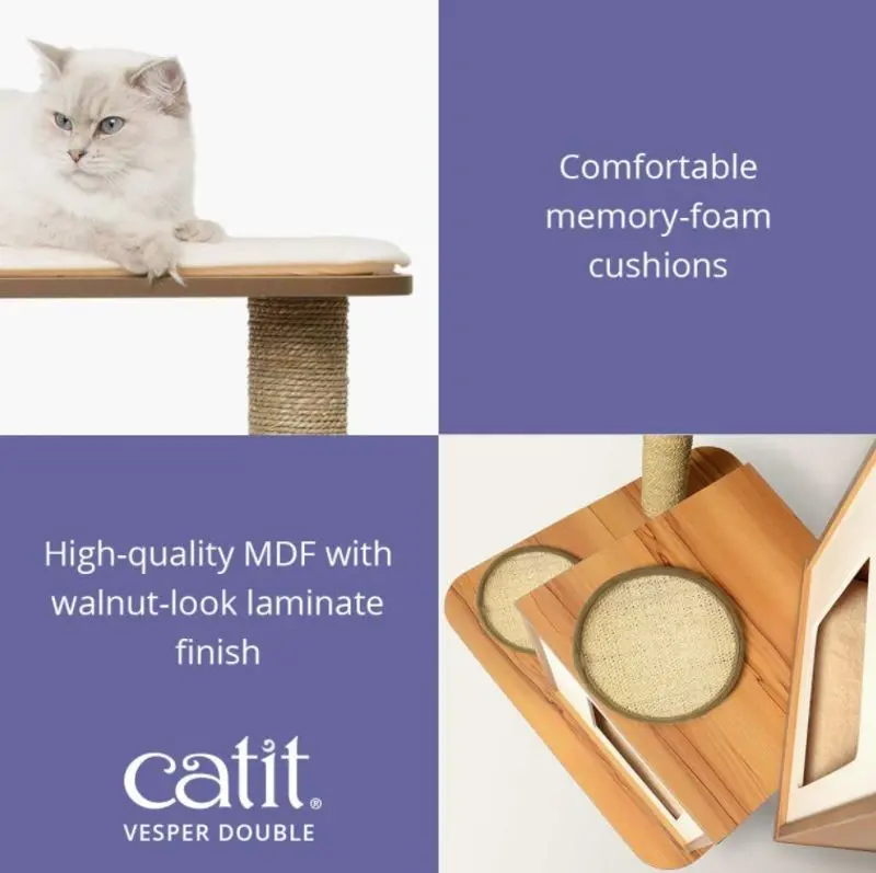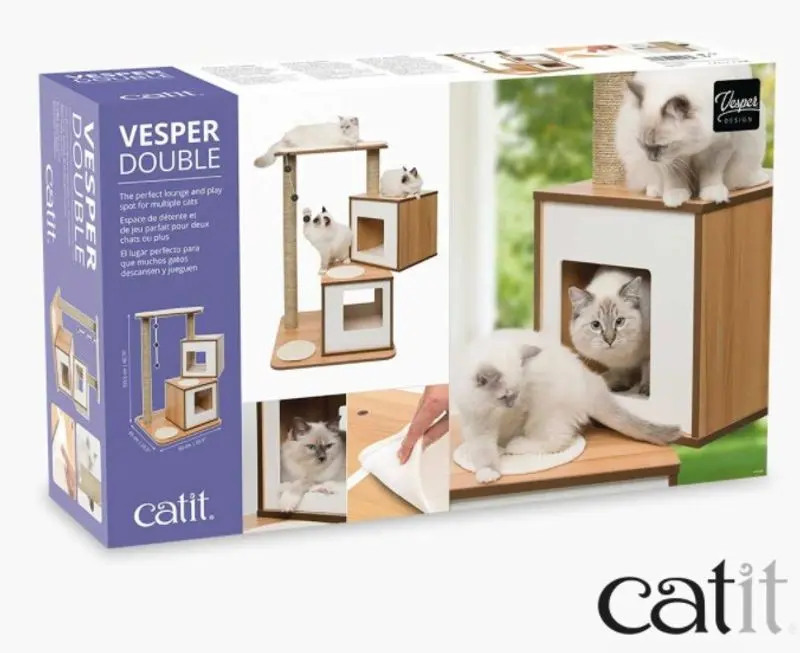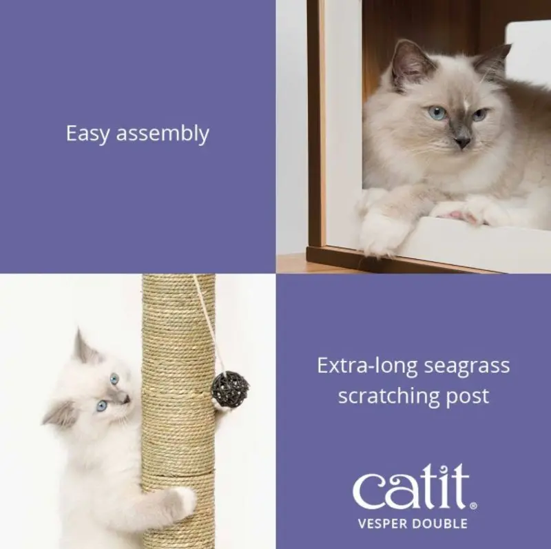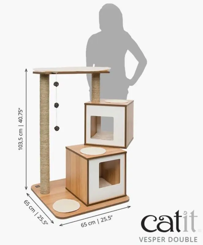 Vesper Double i vit färg, är en kompakt kattmöbel med modern design som verkligen gör sig fin med hemmets inredning. Klösmöbeln är utrustad med 2 mysiga kuber, viloplatser och en klösstolpe. Kuberna är perfekta för catnaps, lek och bus och de är designade med 2 ingångar så att dina katter inte ska känna sig trängda. Perfekt för flerkatts-hushållet!