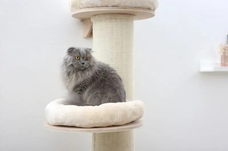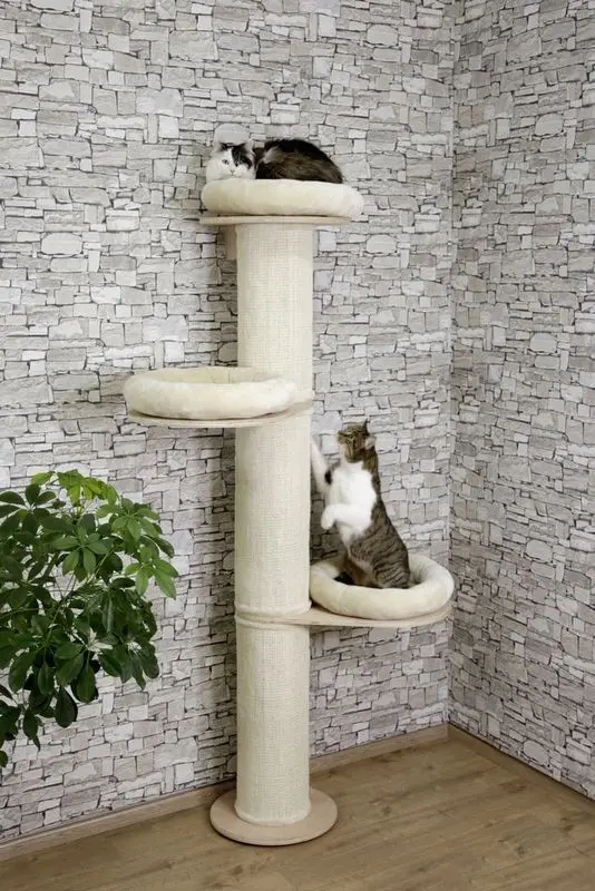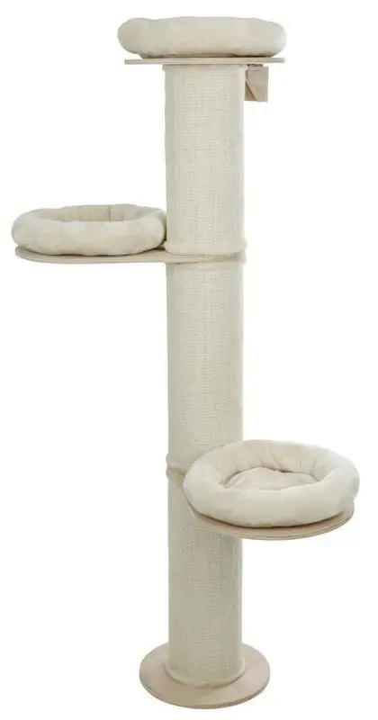 Observera att klösträdet har varma färger, varmbeiga dynor - men är fotad av vår leverantör i ett väldigt kallt ljus. Klösträdet är alltså inte så ljusbeige/kall-beige som det framkommer på produktfoto.