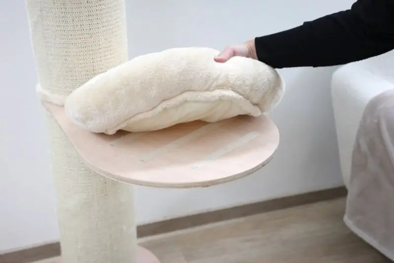 Kattbäddarna sitter fast med kardbordde, de är avtagbara och kan tvättas i skontvätt 30 grader.