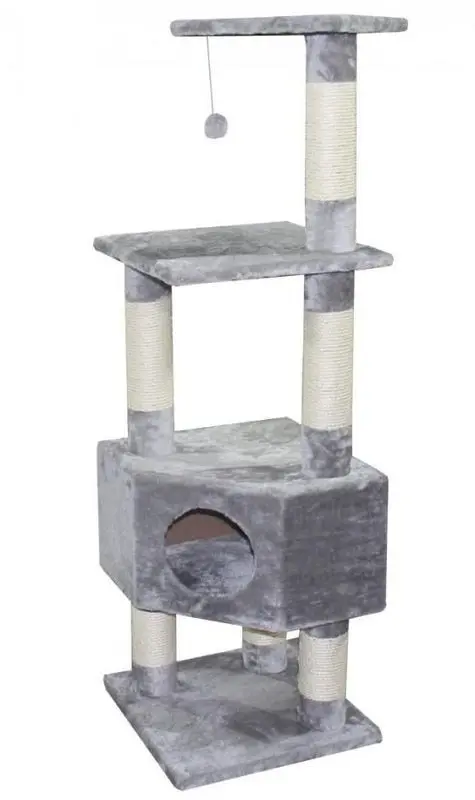 Klösmöbel Felix är tillverkad med grått plyschtyg och klösstolpar lindande med sisalrep.