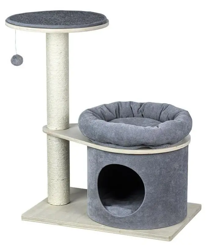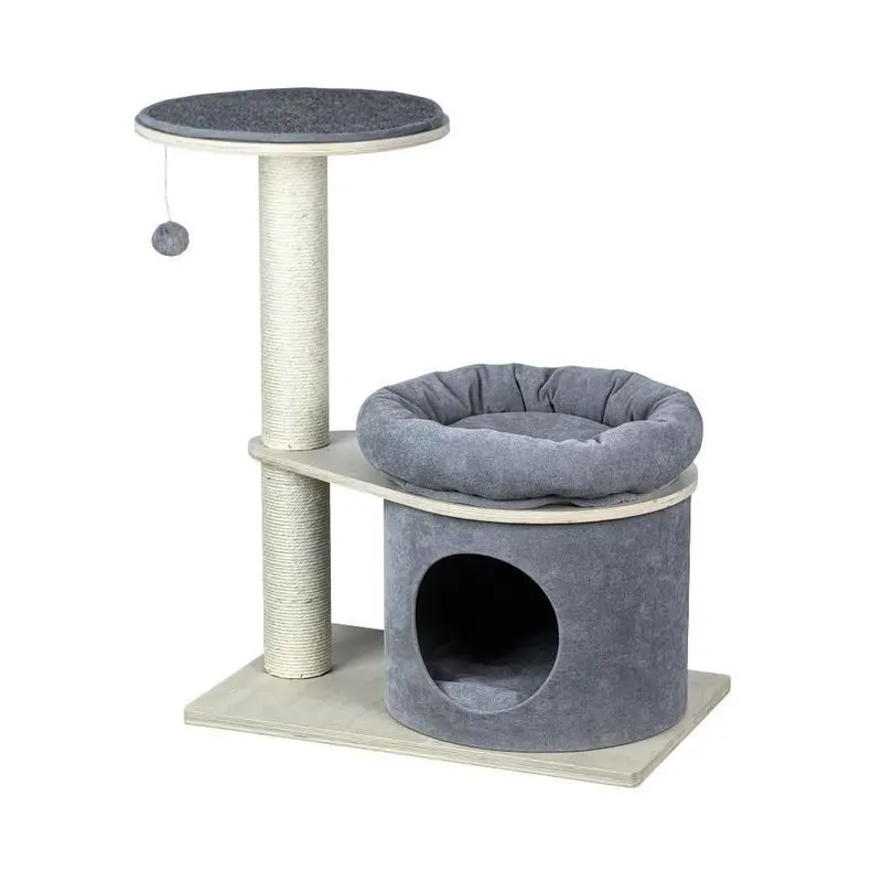 Kuma 3 från Nordic Paws är ett elegant mellanstort klösträd som kombinerar lek, vila och klösmöjlighet i ett. Klösmöbeln har en stadig bas, en tålig klöspelare som är ca 75 cm lång och lindad med sisalrep - perfekt för din katt som vill sträcka upp sig ordentligt när den klöser på stolpen.