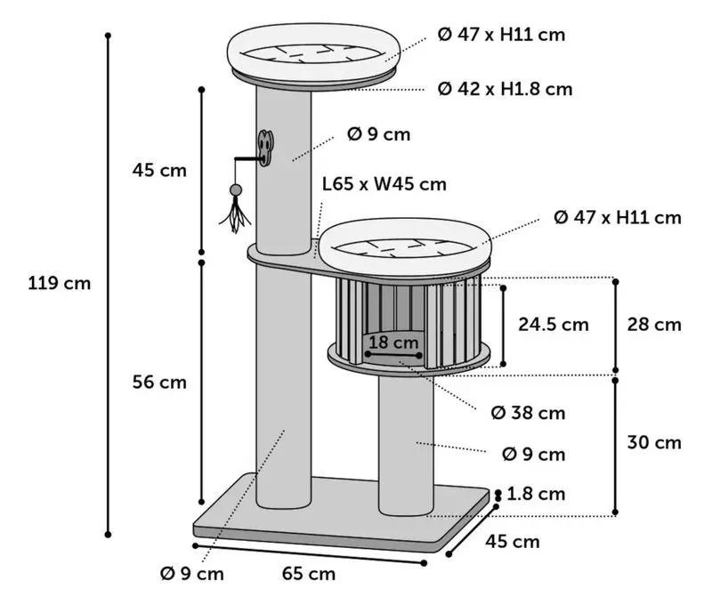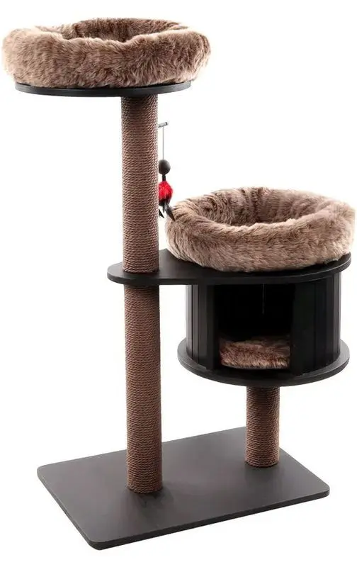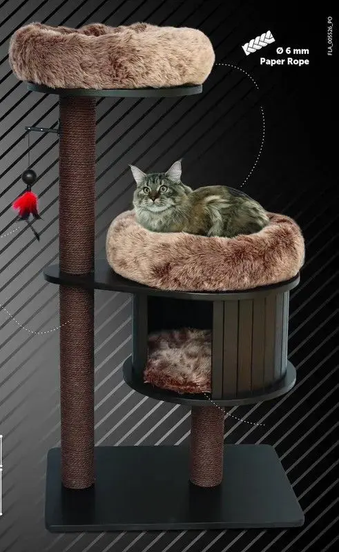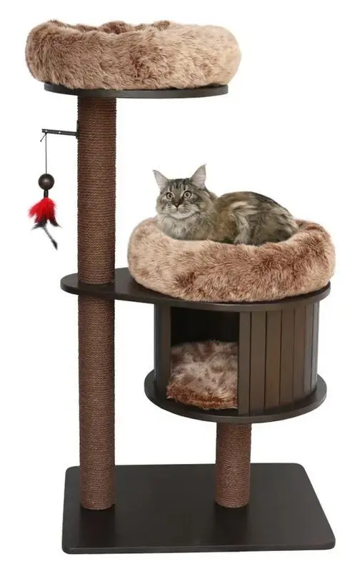 Raisa 1 klösmöbel är en superfin kattmöbel och inredningsdetalj i hemmet. Mörkbruna trädetaljer, 3 st vadderade sovplatser med ljusare brunt plyschtyg och klöspelarna är lindade med ett snyggt och hållbart juterep.