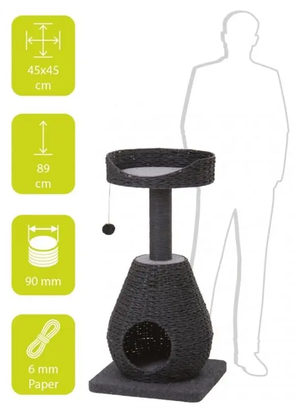 Otroligt snygg klösmöbel till din katt i stilrent svart. Nertill en mysig koja att sova i och upptill en spanarplats i bra höjd. Gör sig riktigt fin i hemmet!