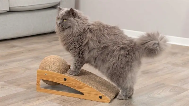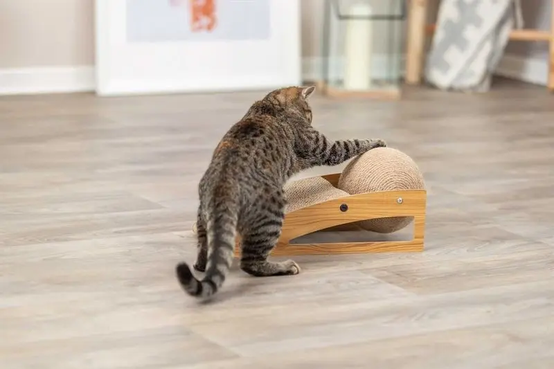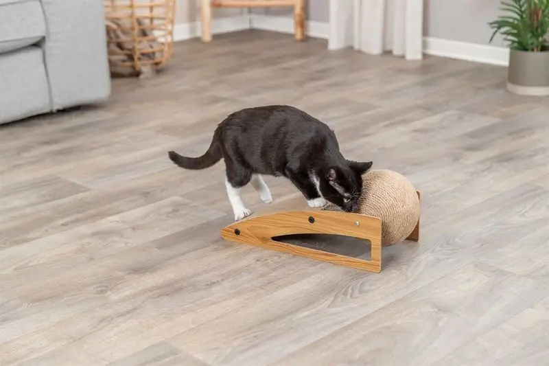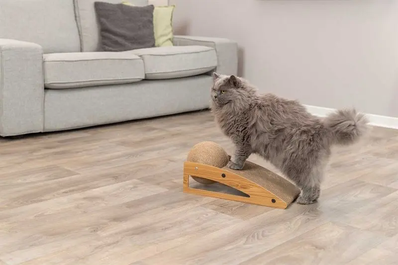 Klösrampen är tillverkad med pressad papp, ett material som katter verkligen gillar. Stativet är tillverkat i MDF och klösbollen har ett jute-rep som klösvänlig yta.