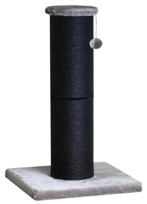 Ljusgrå plysch på bottenplatta och i toppen av klösstolpen, klöspelaren är lindad med ett mörkgrått sisalrep.