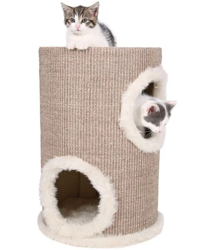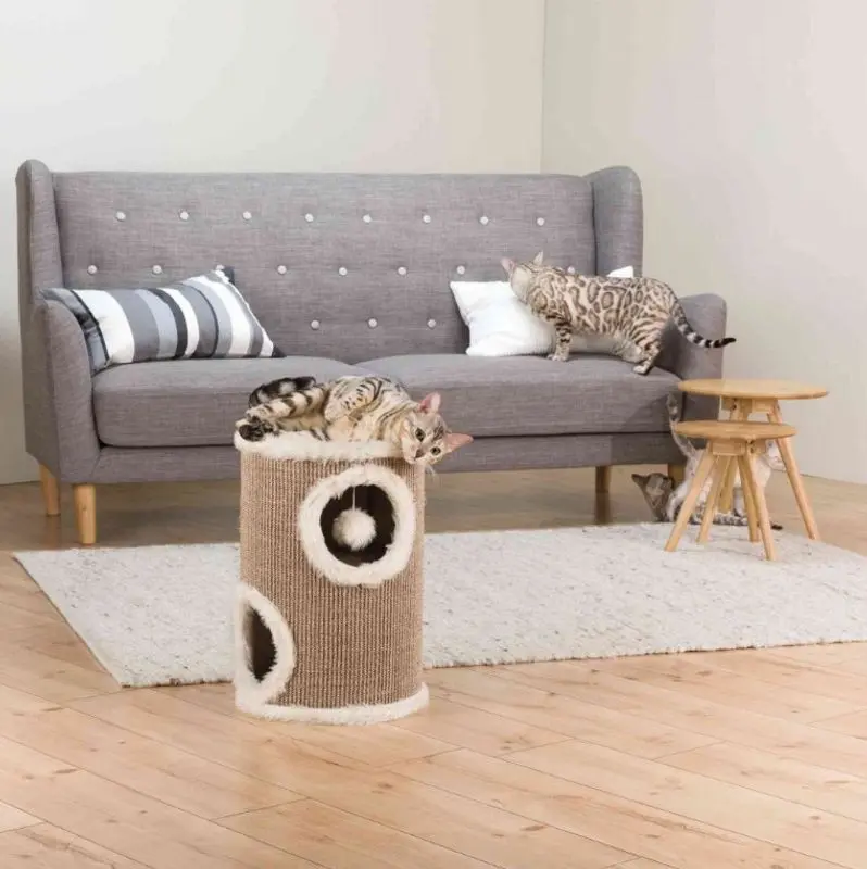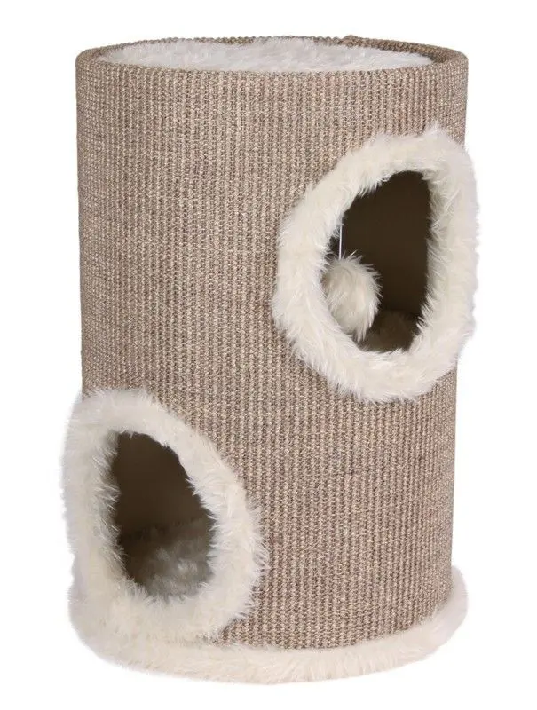 Snygg och funktionell klöstunna med mysigt lurviga runda öppningarna i krypinen. Passar riktigt bra i hemmet och fungerar både som sovplats, klösplats och busplats!