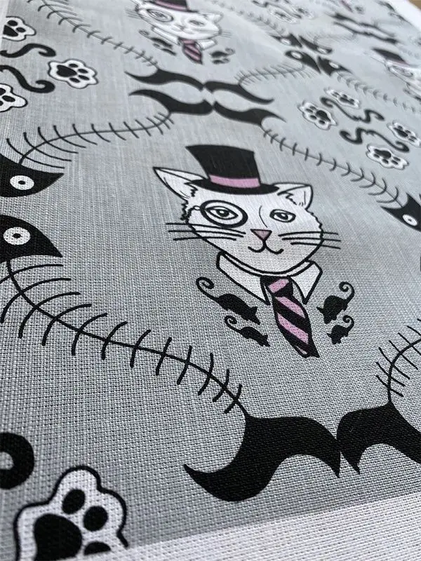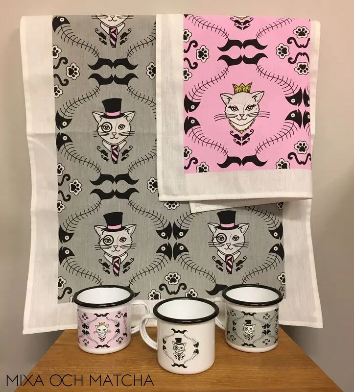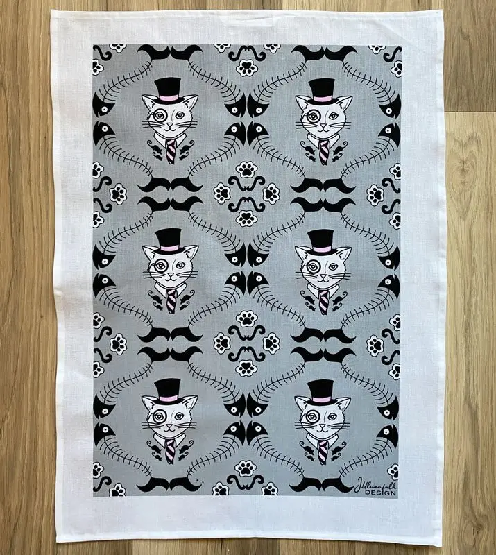 En helt fantastiskt fin och stor kökshandduk, med mönstermotivet Mister som Jenni Ulvenfalk har designat. En fin kattherre med hatt och monockel på grå bakgrund.