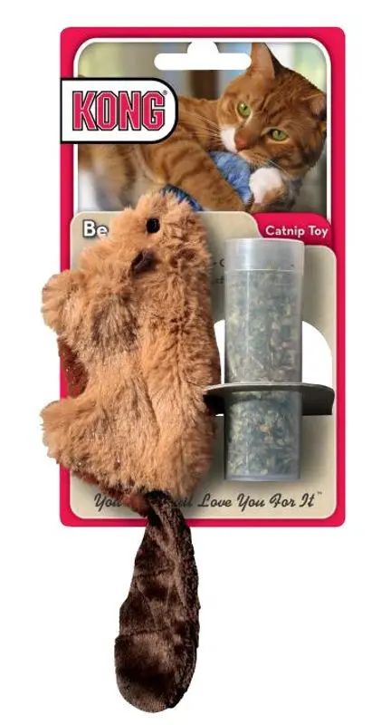 Mjuk och gullig bäver som aldrig går säker för det livsfarliga hemmalejonet som ständigt är på jakt i vardagsrummet. En orsak till detta kan vara den smarta fickan med kardborre som bävern har på magen och som lätt fylls på med Kongs härliga kvalitetskattmynta i det medföljande plaströret.