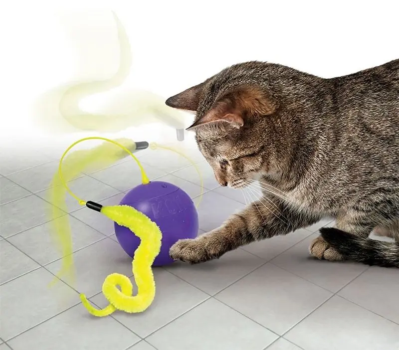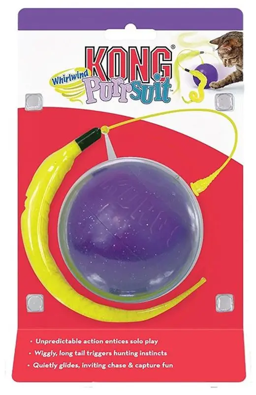 Kong Cat Purrsuit Whirlwind är en rolig interaktiv kattleskak som rullar runt sig själv på golvet och därmed även svänger med den gula svansen som sitter fäst i bollen. Svansens lockande rörelser som virvlar omkring på golvet lockar din katt till lek och bus!