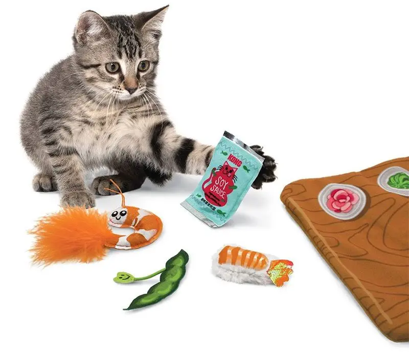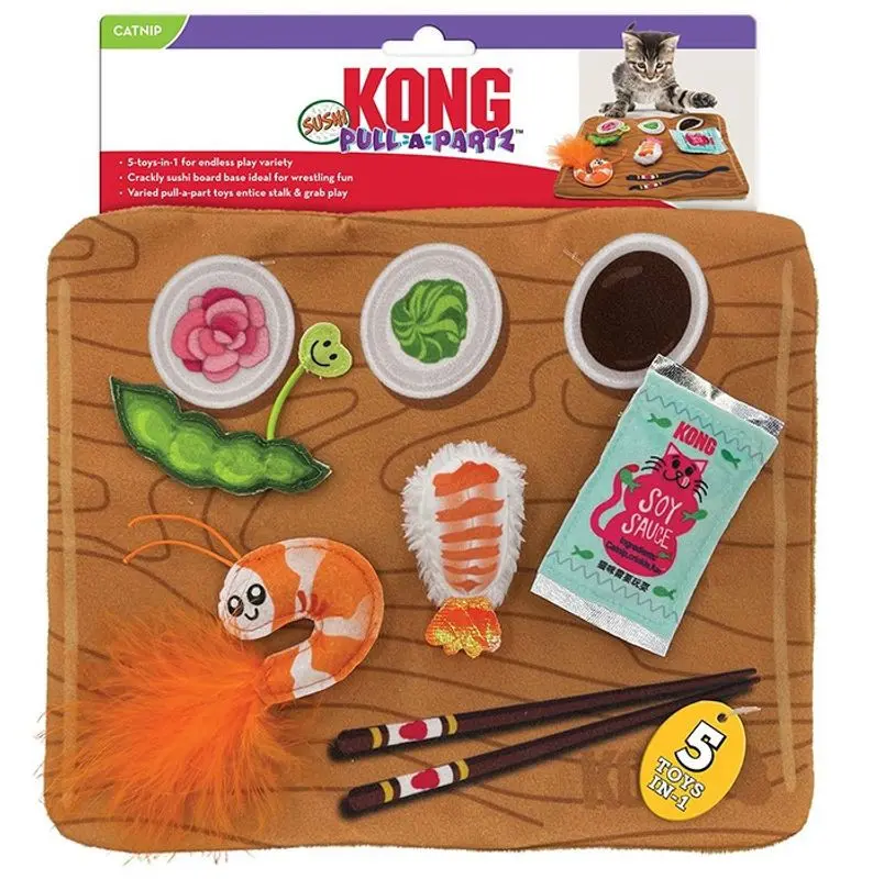 KONG Pull-A-Partz Sushi är "5-leksaker-i-1". Leksaken levererar en sushi-fest där din katt pillra loss leksakerna från "brickan" - den uppmuntrar till lek med både tassar och sinnen; doft och hörsel (med kattmynta och prassel). Att dra gröna edamamebönor, räkor och sojasås från kardborre är roligt, och Kongs Premium Nordamerikanska starka kattmynta peppar till mer lek och bus!