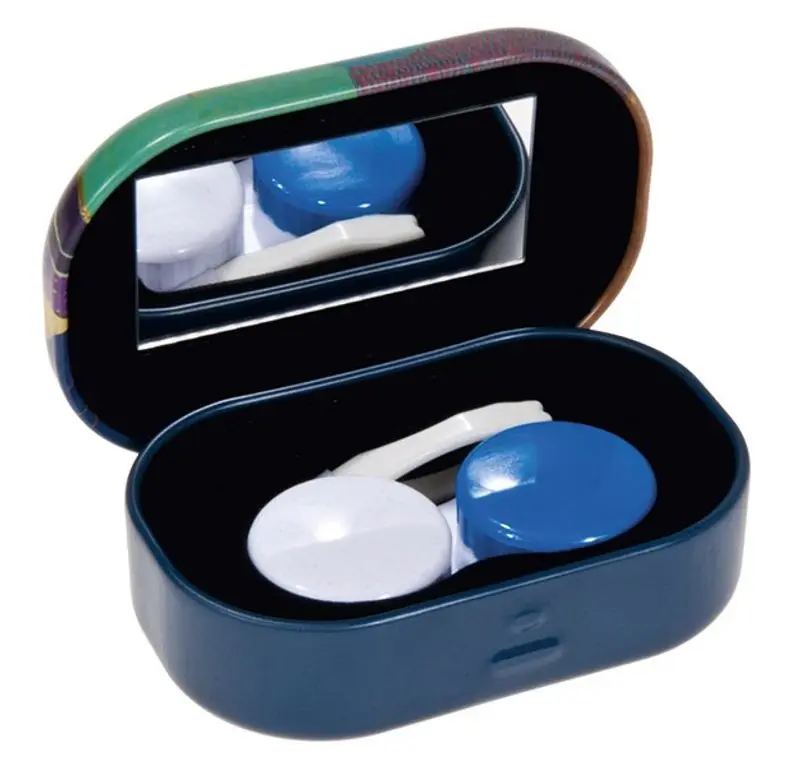 Jättefin liten ask i metall som innehåller spegel i locket, ett etui för kontaktlinser samt en liten pincett. Mycket praktiskt ask att ha med sig, snygg dessutom!