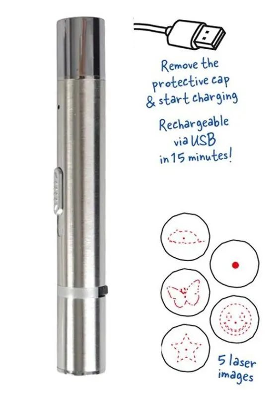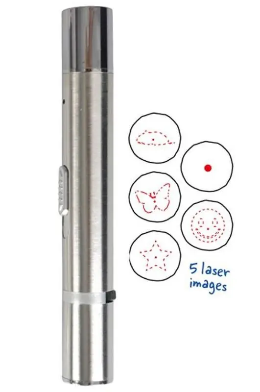 Det finns ytterligare 4 olika bilder för din katt att jaga, förutom "standard-pricken". Pekaren har LED-ljus och UV-ljus samt en handleds-snodd.