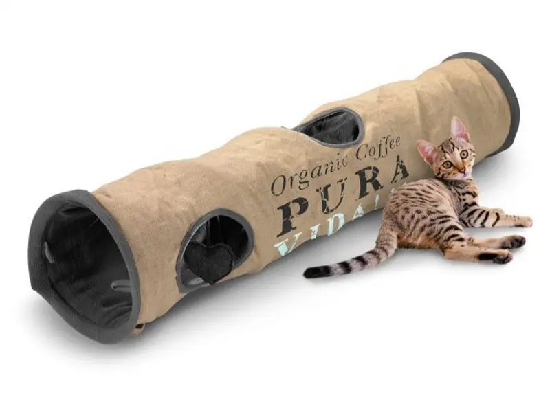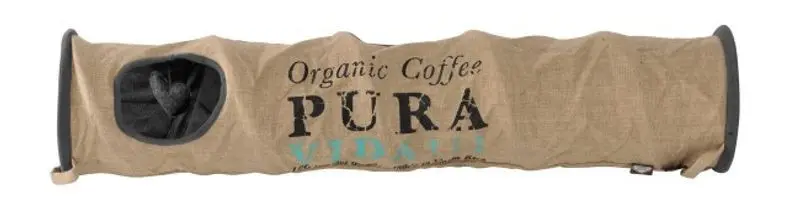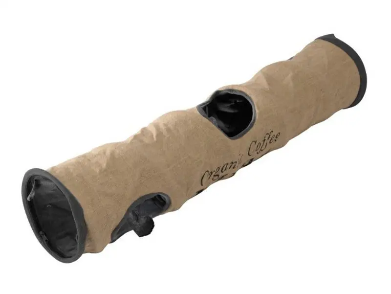 Extra lång och extra fin lektunnel tillverkad till hälften i jute och hälften i polyester med fint Coffe-print på sidan. Mycket snygg lektunnel som gör sig fin i hemmet. 4 st ingångs/utgångshål och prassel som lockar din katt till lek.