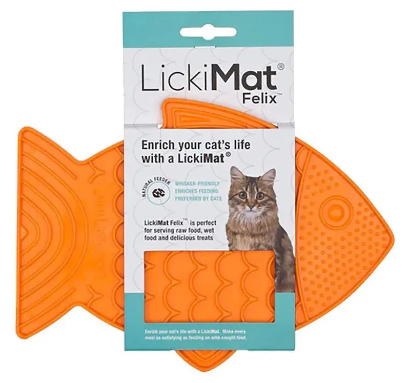 LickiMats fisk-modeller har en mer komplex yta designade speciellt för katter för att bättre efterlikna naturlig utfodring och för att ge stor variation på samma yta. Dessa ytor ger en varierad utmaning för katter att "tugga ur" maten eller godiset, vilket berikar matningsupplevelsen. Denna foderplatta har en orange färg.
