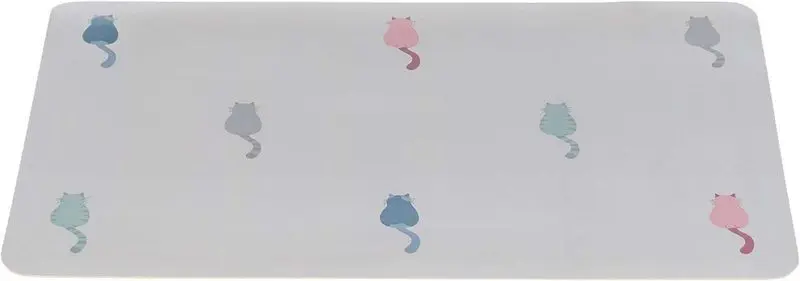 Klassiskt matskålsunderlägg i perfekt storlek för 2 st kattmatskålar. Grå bottenfärg och fint motiv med flera färgglada kattsiluetter.