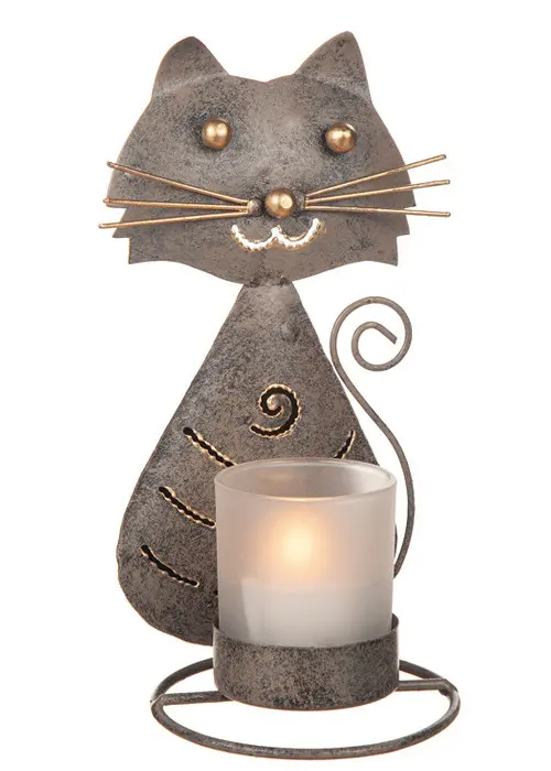 En riktigt fin handgjord ljuslykta i hamrad plåt, 20 cm hög med kattmotiv. Finns i 2 olika färger; en grön och en silvrig (grå).