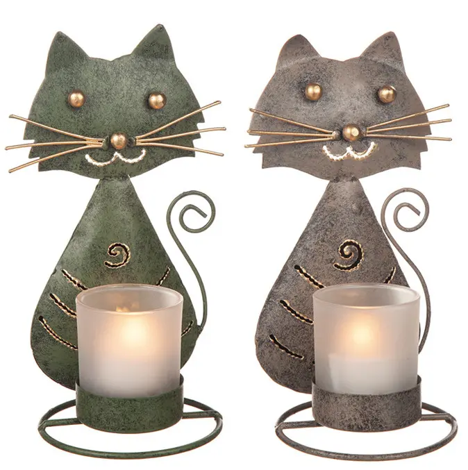 En riktigt fin handgjord ljuslykta i hamrad plåt, 20 cm hög med kattmotiv. Finns i 2 olika färger; en grön och en silvrig (grå).