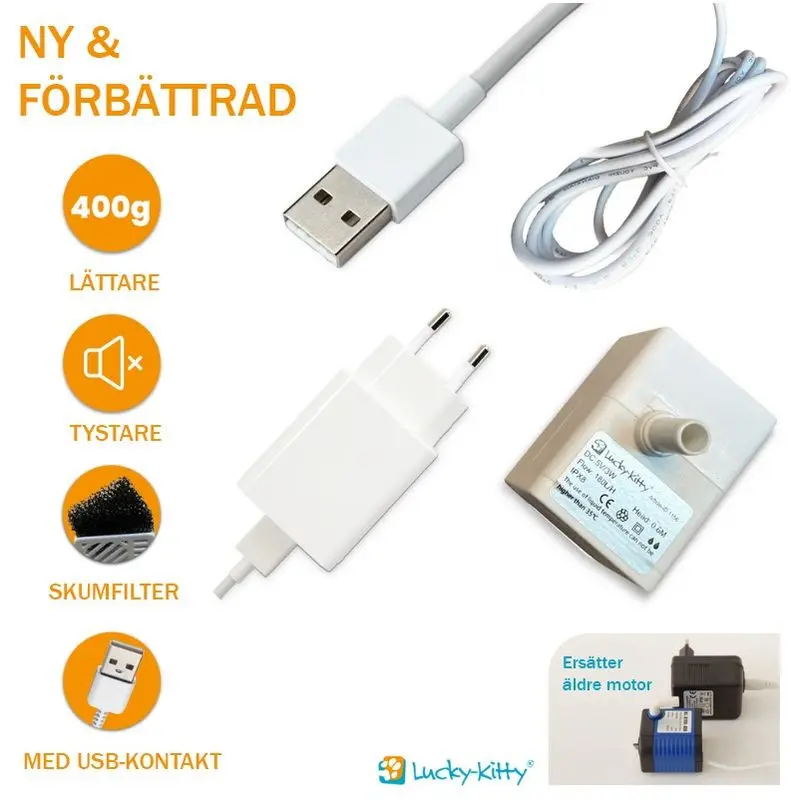 Lucky-Kitty har moderniserat och bytt ut sin gamla motor mot en ny motor med modern USB-drift. Denna nya motor passar även att byta ut den äldre motorn med, om det är så att ni har "den gamla svart-blå" motorn i er fontän. Pumpen kan även användas till vattenfontäner av andra märken som är utrustade med pumpar av lägre kvalitét.