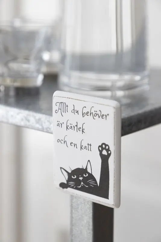 Vit färg med svart text och kattmotiv.