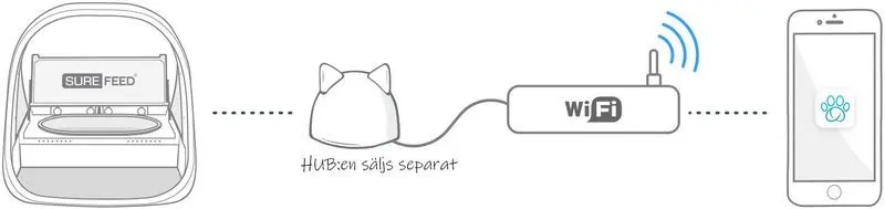 SureFeed Microchip Pet Feeder Connect är den uppgraderade varianten av standard-Surefeed. Med Connect-varianten har du som ägare möjlighet att koppla den smarta foderautomaten till en app i din telefon - men observera att du även behöver köpa till HUBen för att detta ska fungera. (Samma HUB kan användas till upp till 10 Surefeed-enheter, både foderautomater och kattluckor).