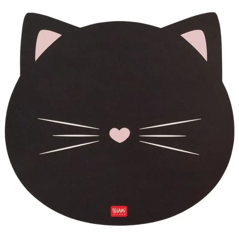 Denna söta musmatta från Legami har formen av ett svart katthuvud med rosa hjärtenos. Musmattan har en ovansida i PVC som motverkar damm och reflexer, och en gummerad undersida för att hindra den från att glida omkring på bordsytan.