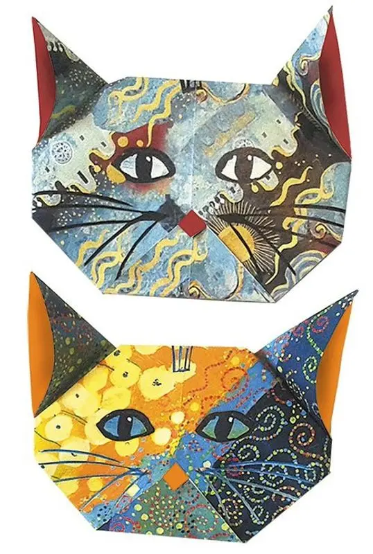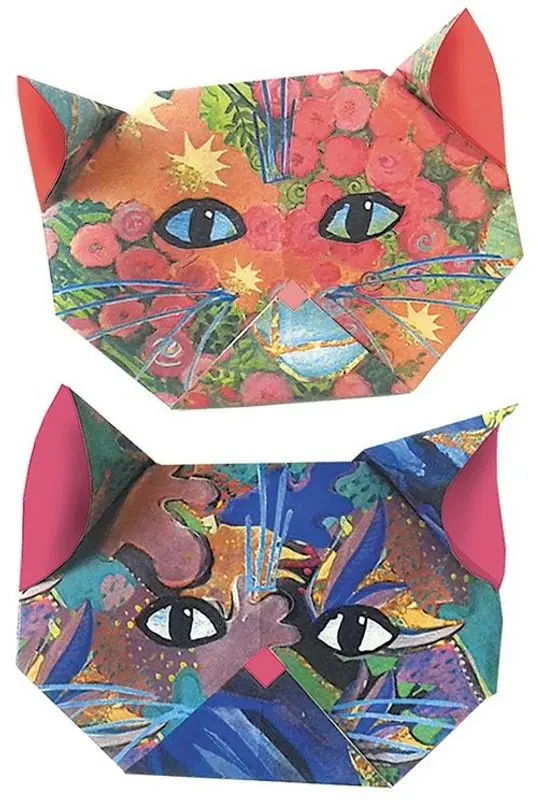 Origamiförpackning med olika mönster för att kunna vika fina katter! Svårighetsgrad: olika svårighetsgrader. Instruktion med bilder och engelsk text medföljer.