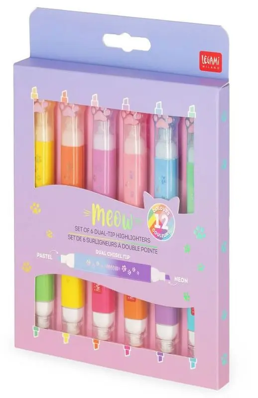 Legamis set med överstrykningspennor, eller highlighters som de även heter, är en förpackning med en härlig blandning pastellfärger. 6 st pennor med dubbla tippar ger dig 12 st pastellfärger att välja mellan (se produktbild nr 2).