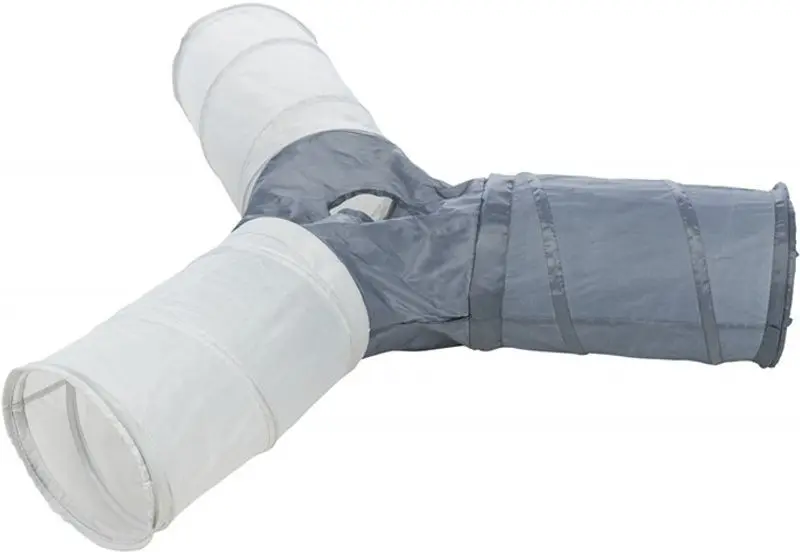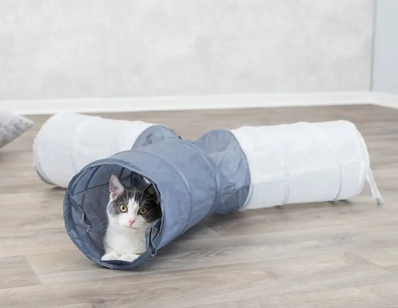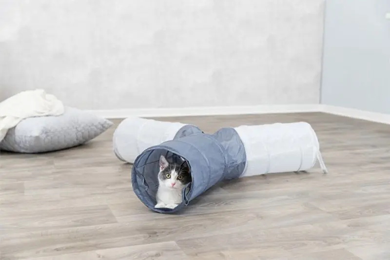 Prasseltunneln är lätt att fälla ihop till ett platt paket och stoppa undan när katten inte leker med den.