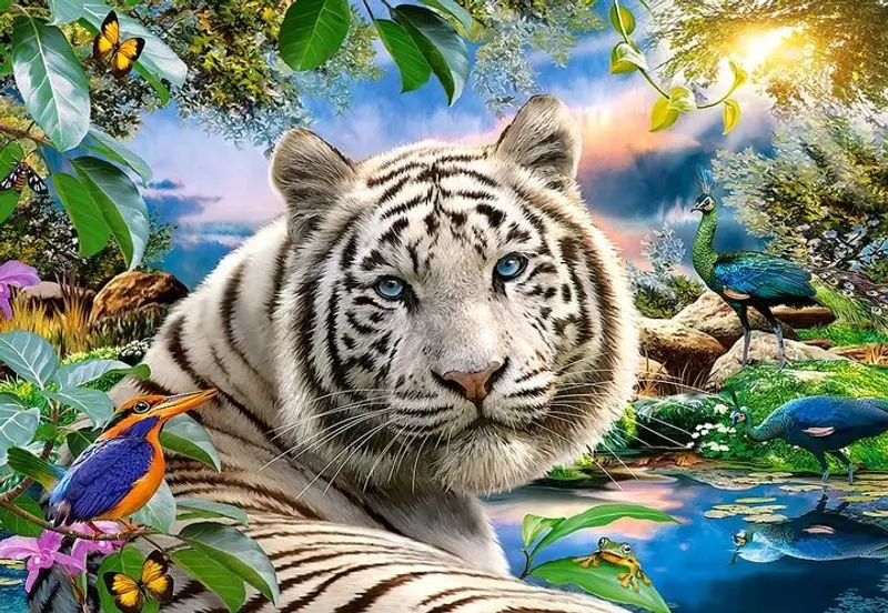 Superfint pussel med härligt motiv av en vit tiger med en läcker tropisk bakgrund.