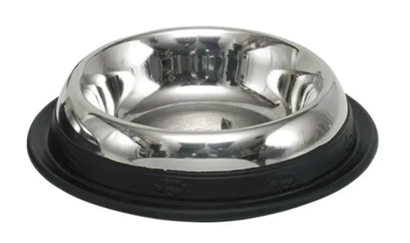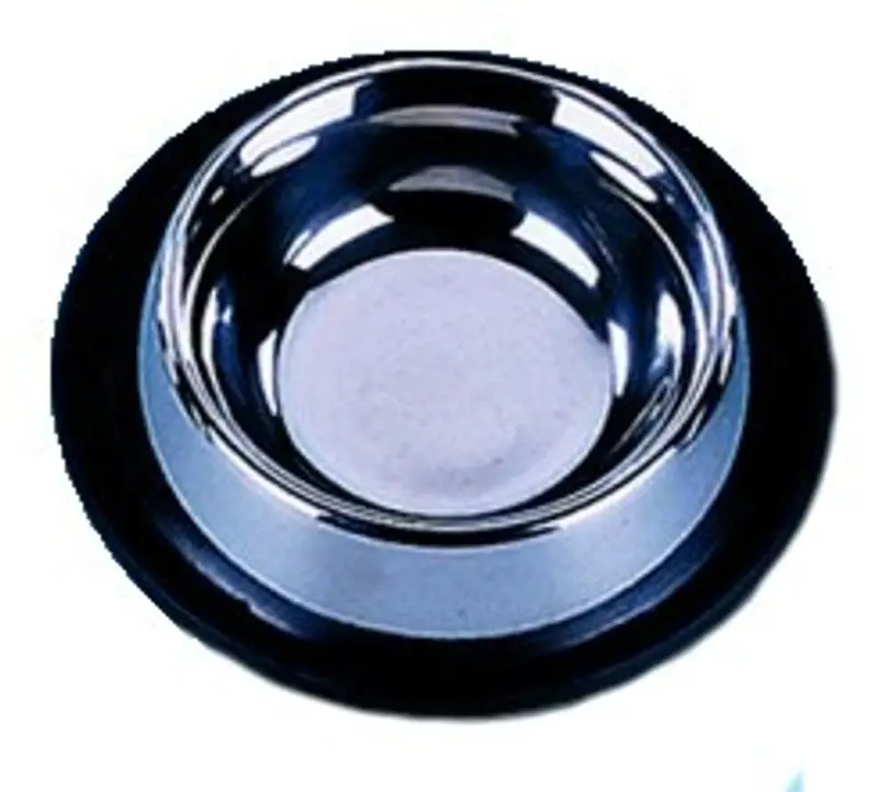 Kattmatskål eller vattenskål i rostfritt stål med gummiundersida så skålen hålls på plats.