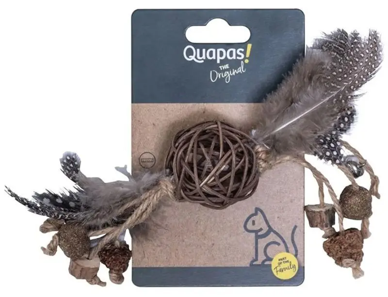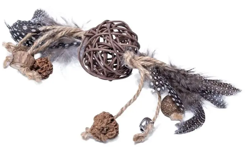 Bollen består av en rottingboll, med fjädrar och sisalrep på sidorna. I sisalrepet finns det en torkad liten boll med kattmynta. 2 st matatabi-trähängen samt torkade matatabi-frukter och en pingla. Allt som är roligt och lockande för en kissemiss :)