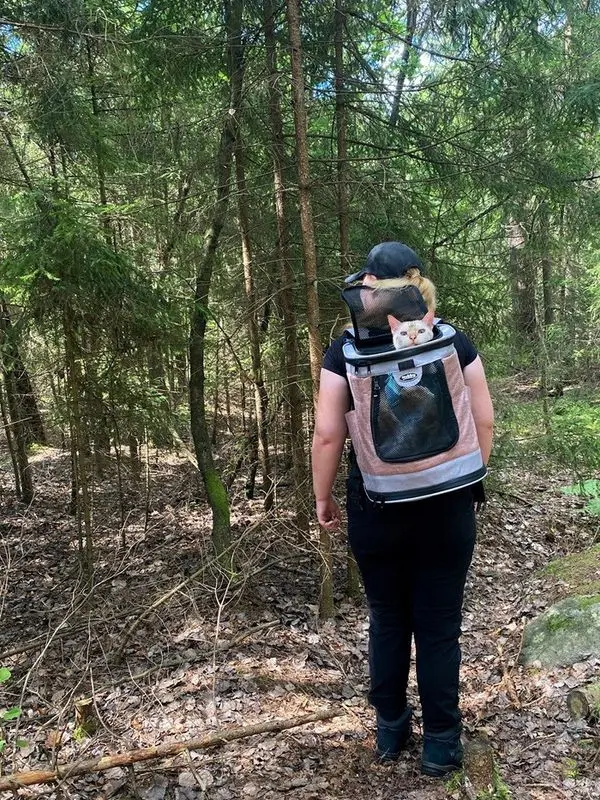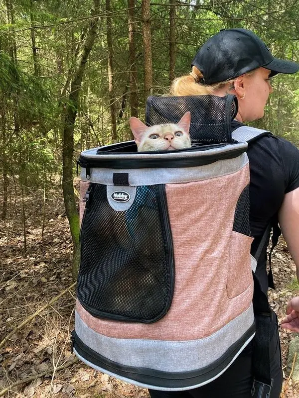 Väskan kan öppnas framtill och på ovansidan för katten och har ett kort koppel fäst på väskans insida så att katten inte kan hoppa ut om man vill ha väskan lite öppen. Mjukt meshtyg i flera sektioner ger en god luftcirkulation inuti väskan.