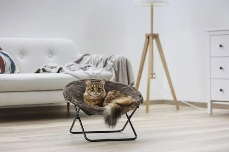De flesta katter sover gärna lite högre upp än golvnivå, detta gör att Sharon-bädden med sitt bruna lurviga tyg är perfekt för katter som gärna sover eller spanar lite högre upp.