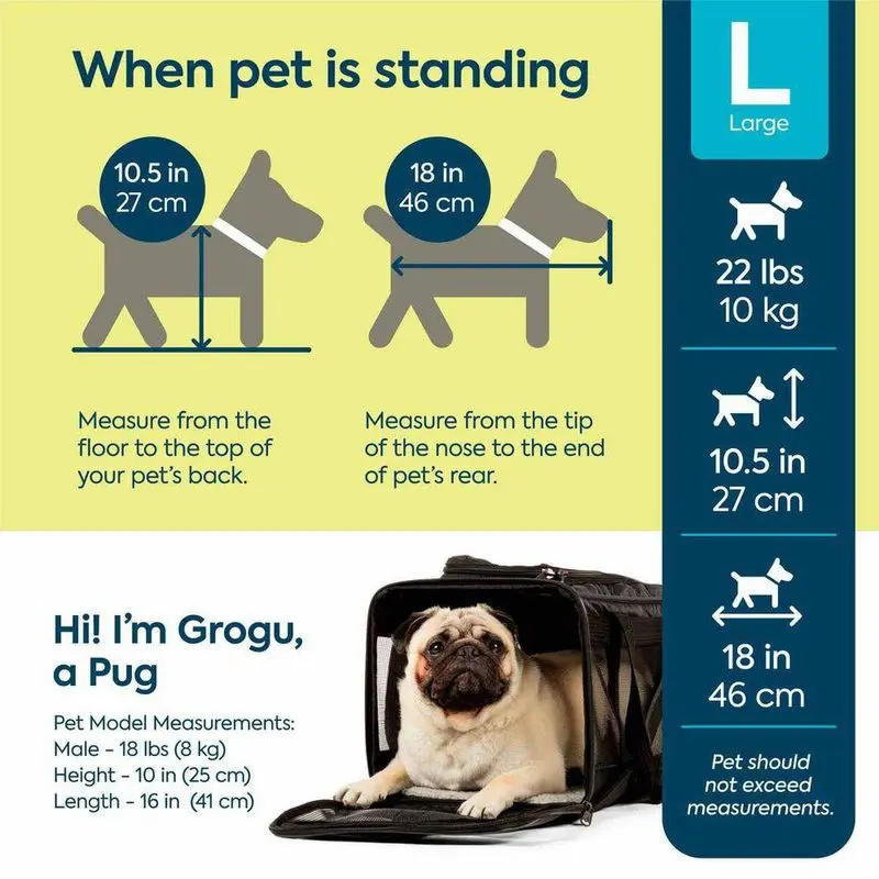 Storlek Large: 48,2 x 29,8 x 29,2 cm (maxvikt djur 10 kg, väskans vikt ca 2,1 kg)