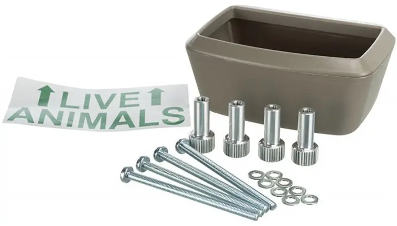 Set med 1 st vattenskål, skruvar samt klistermärke för att IATA-transportburen ska få skickas som Cargo.