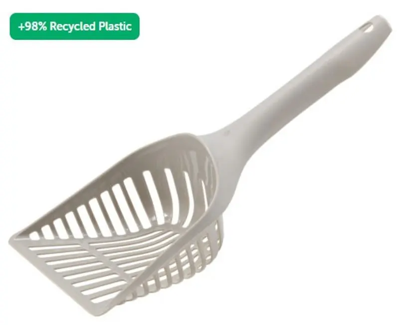 Stor och behändig spade till kattlådan, tillverkad i återvunnen plast! Spaden har ett ergonomiskt handtag som gör att den är skön att hålla i handen vid den dagliga skopningen av kattlådan. Snygg grå färg som matchar de flesta kattlådor.
