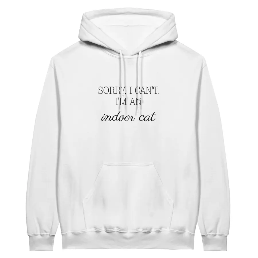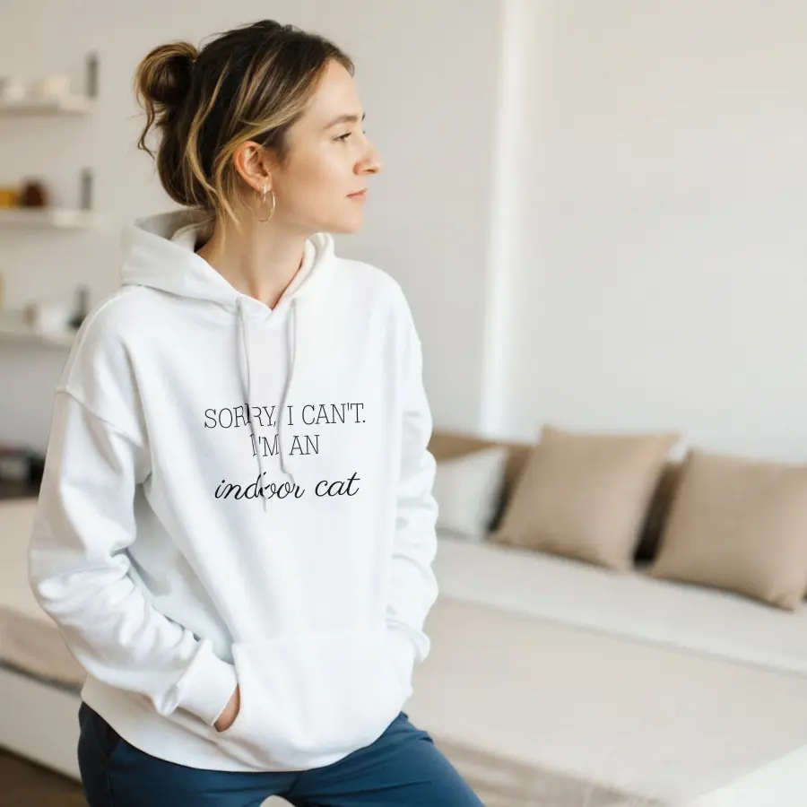 En vit luvtröja i mysig mjuk kvalitet och med bra passform. En tröja som passar dig som "innekatt" perfekt, du sitter kanske hellre hemma i soffan med en god kopp te och en bra bok - tillsammans med dina kissemissar - än att hoppa fallskärm.