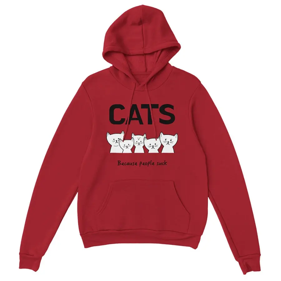 Tryckt med texten: Cats [bild katter] because people suck. Trycket sitter på framsidan, medan baksidan är enfärgad.