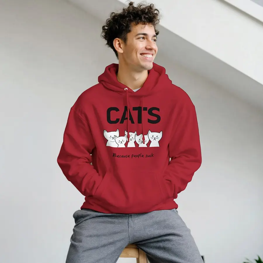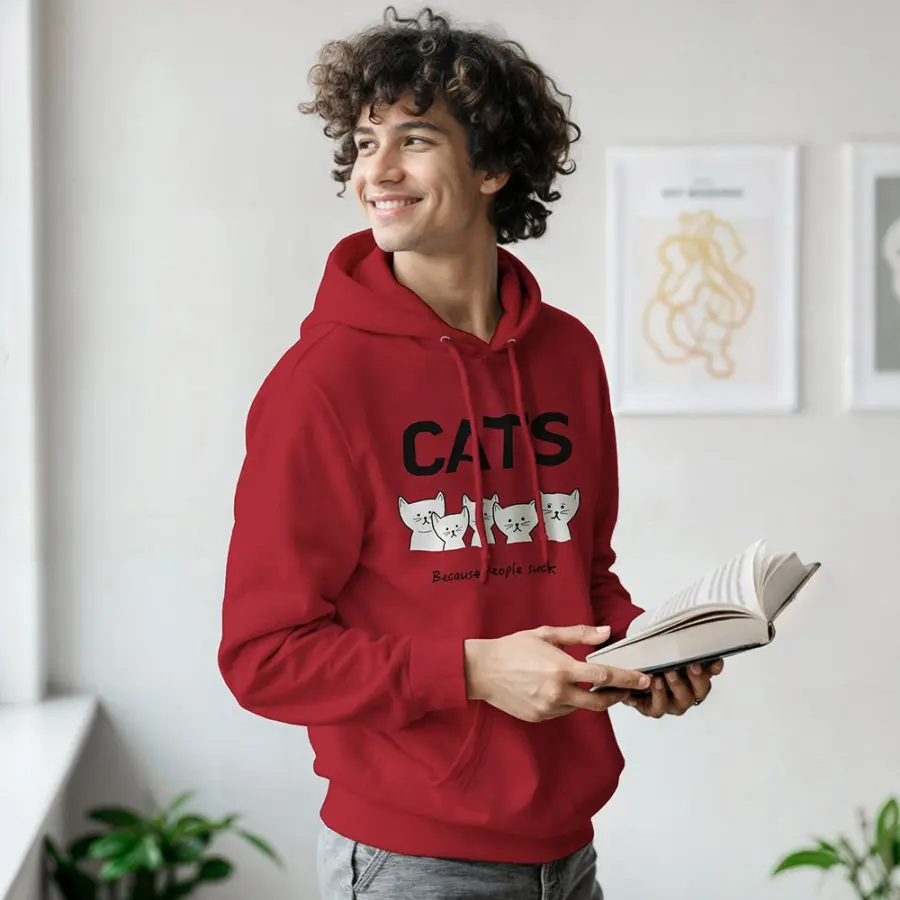 Tryckt med texten: Cats [bild katter] because people suck. Trycket sitter på framsidan, medan baksidan är enfärgad.